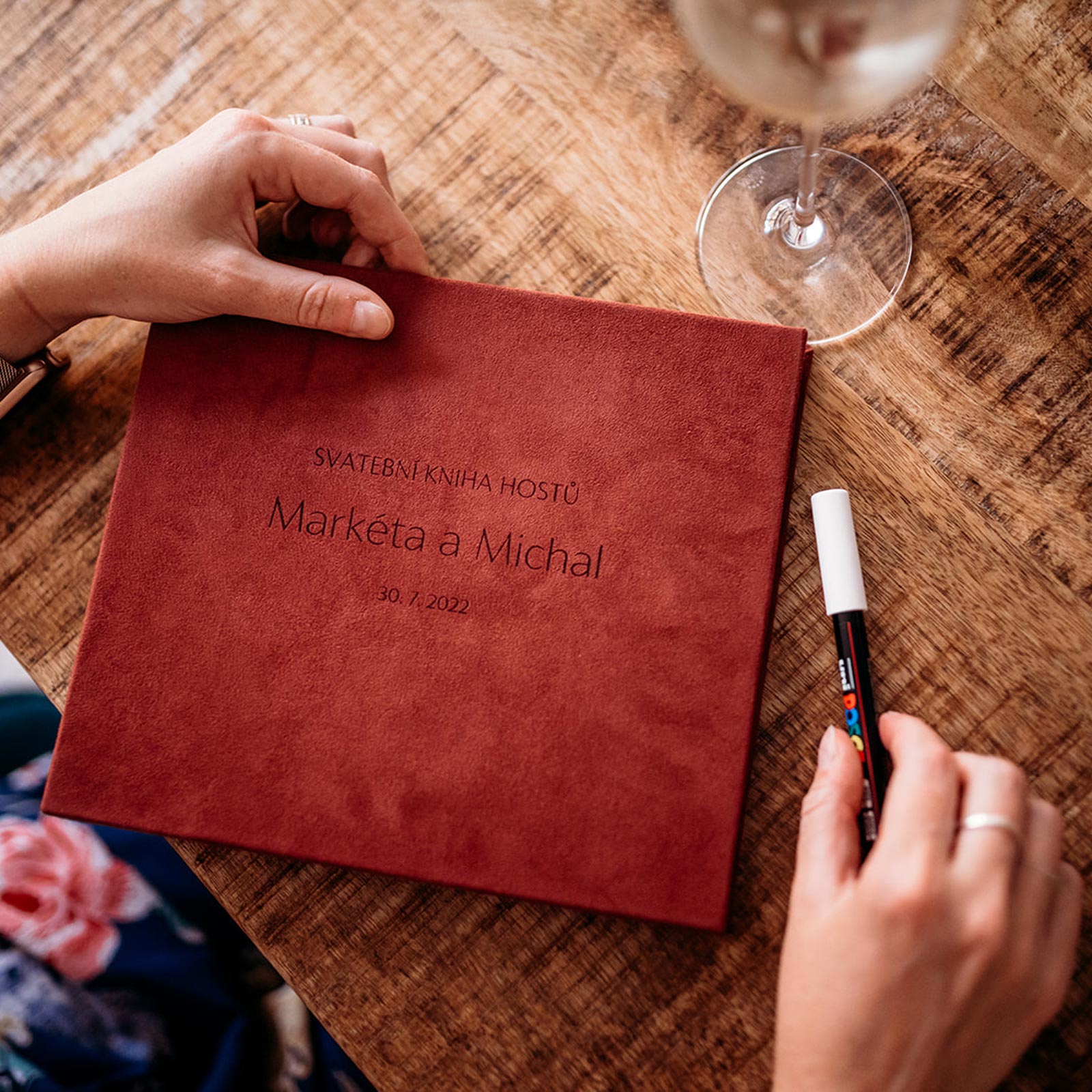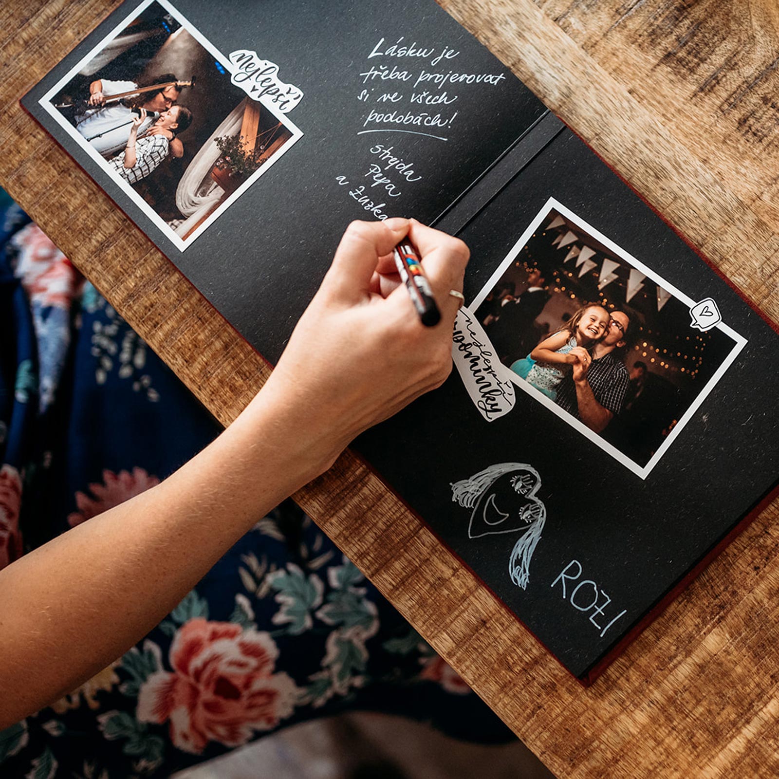 "Těší mě 'eko' vnitřní papíry. Přední a zadní desky jsou oddělené, takže je vidět krásná vazba. Gravírování na desky je v ceně, což je paráda. Fotoalbum je úžasné v tom, že si můžu fotky pěkně osahat, vyzkoušet různé varianty umístění atp. Fotoalbum lze využít jako návštěvní knihu nebo knihu na vzkazy a polaroidové fotky na svatbu, oslavu, firemní akci… Oceňuji i to, že ho mohu sladit s fotoknihou či mini leporelem."